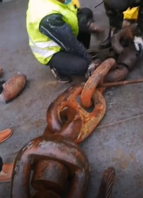 4、用專用機器夾住惰鏈,再用錨機把惰鏈放出擺在甲板上,等到另外的連接鏈環(huán)放到甲板上。