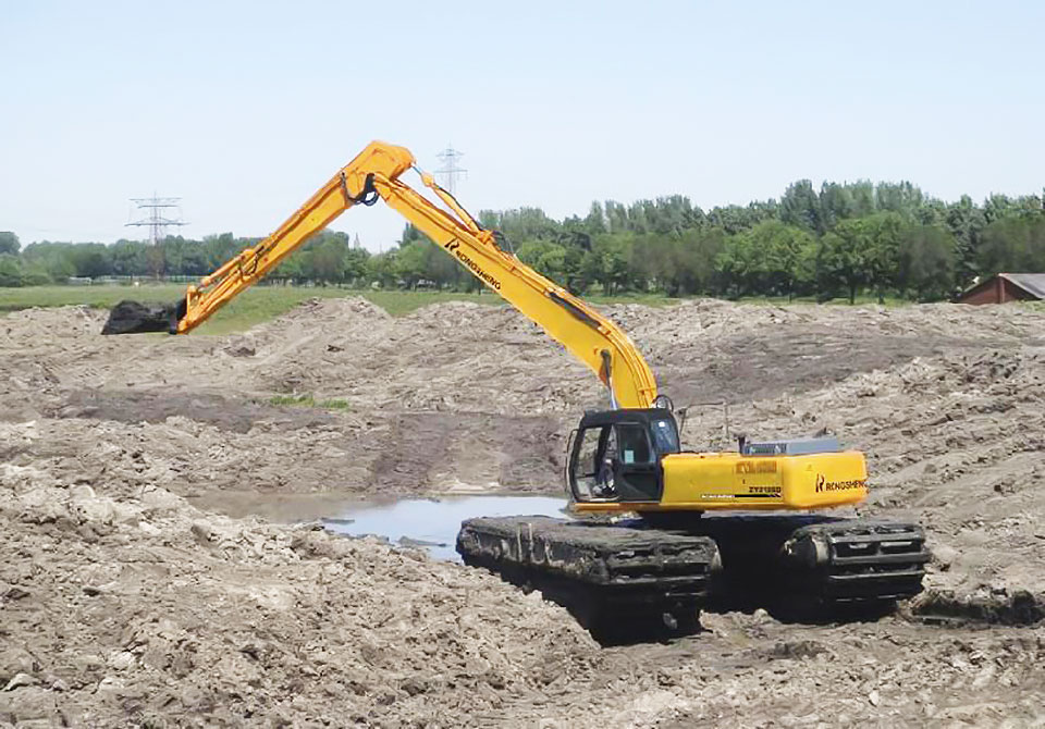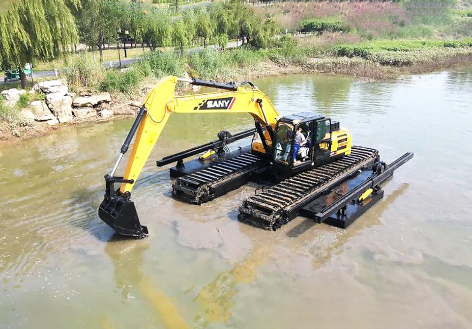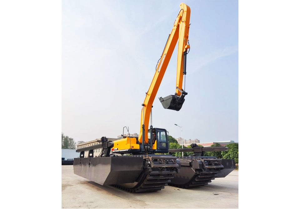 水陸兩用(兩棲)挖掘機(jī)是一種適用于陸地、沼澤軟地面及淺水作業(yè)環(huán)境的多用途工程機(jī)械。其行走裝置采用多體船式浮箱結(jié)構(gòu)及密封箱形履帶板,可在淤泥、水面及地面行走與作業(yè)。